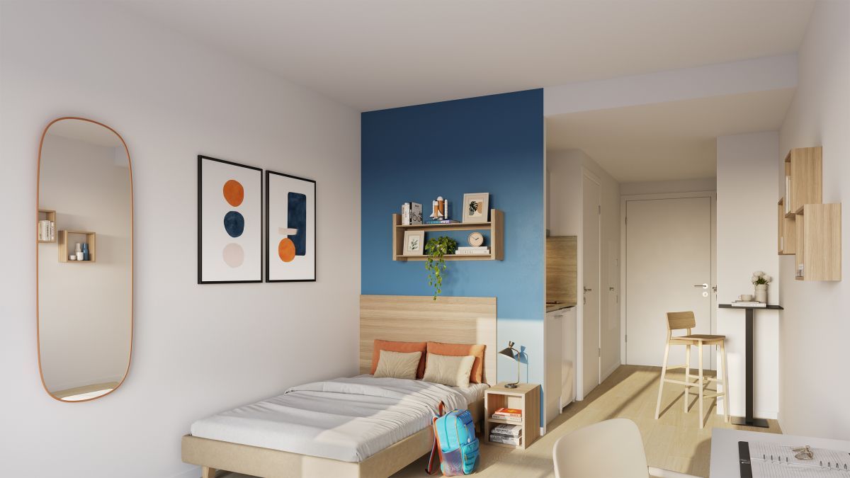 Les studios tous meublés et équipés, sont complétés par des espaces partagés : cuisine et salle commune, terrasse paysagée et laverie.